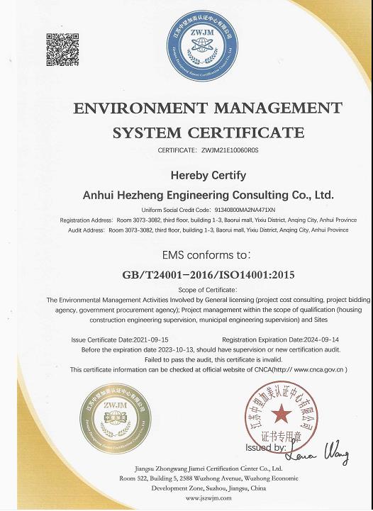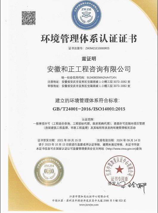 環(huán)境管理體系認證證書