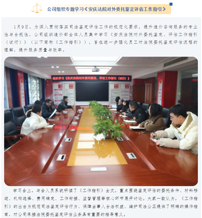 公司組織專題學(xué)習(xí)《安慶法院對外委托鑒定評估工作指引》